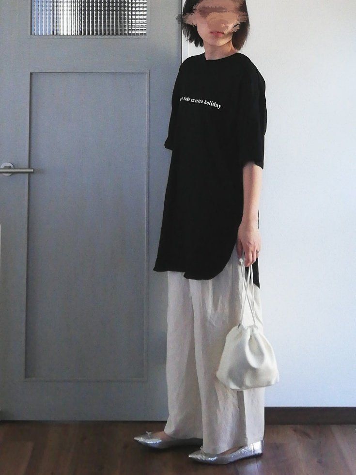 エクリュカラーのワイドパンツに合わせると大人っぽくこなれた印象に。シルバーのバレエシューズで足元にアクセントをプラスした大人カジュアルな着こなし。