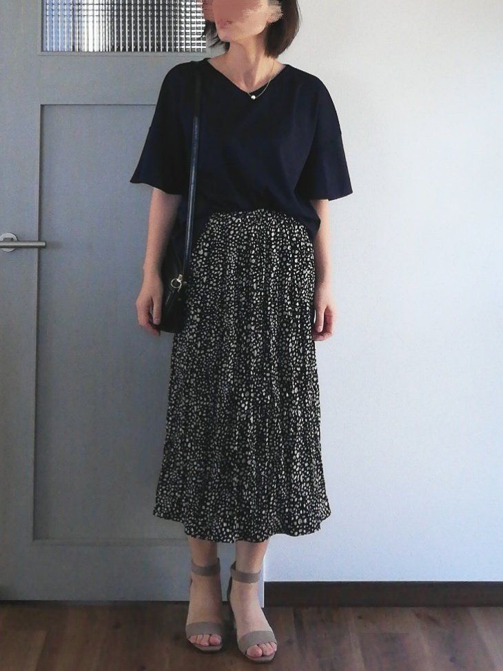 モノトーンの柄スカートに合わせて、落ち着いた印象のきれいめな着こなしに仕上げました。