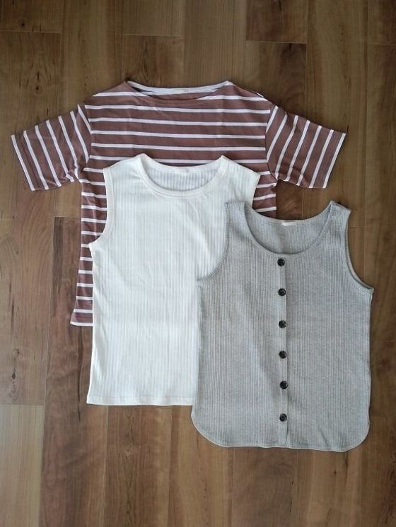 上からボーダーボートネックT・リブタンクトップ・フロントボタンタンクトップ。お値段はもちろんすべて990円!