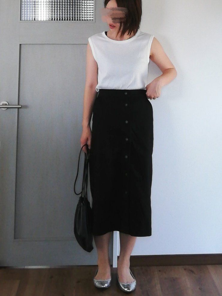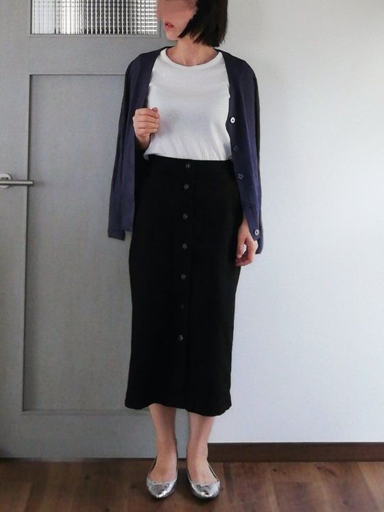 フロントボタンタイトスカートに合わせたシンプルきれいめな着こなし。モノトーンコーデにシルバーのバレエシューズでアクセントをプラス!