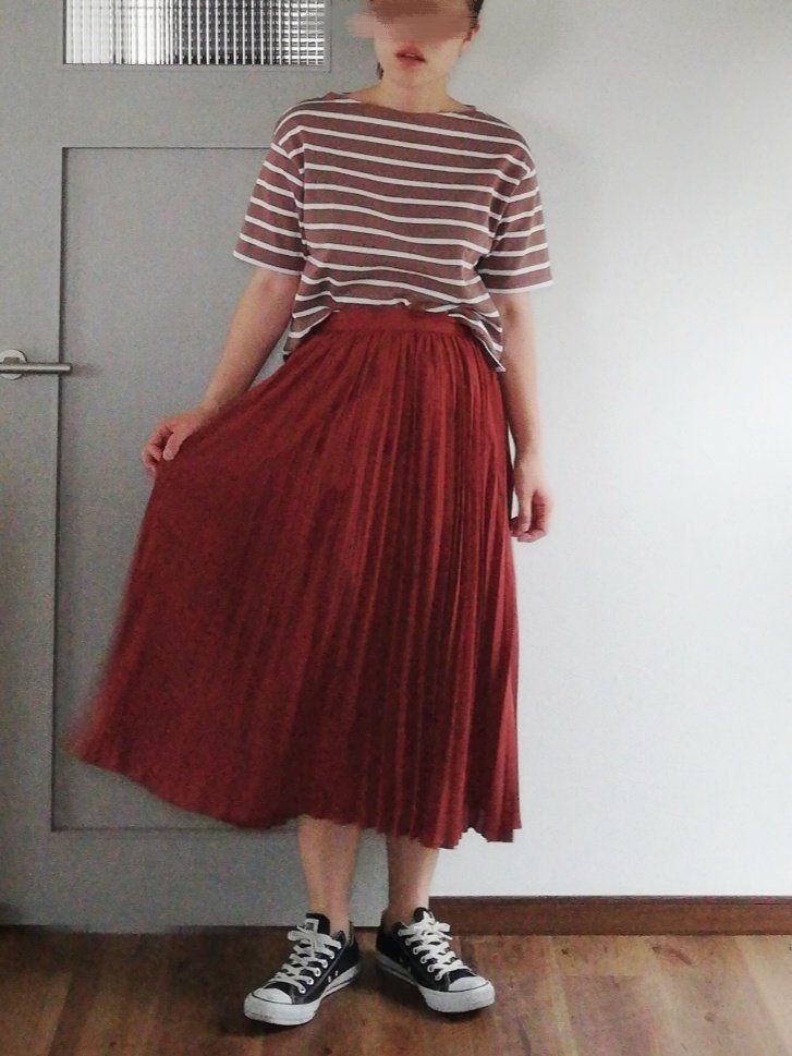 ボートネックのほどよい開きが大人っぽい印象に見せてくれます。レンガ色のプリーツスカートとブラウンのトップスで、色みを合わせたワントーンコーデに。足元はスニーカーでカジュアルダウン。かわいくなりすぎない、好感度の高いカジュアルコーデ。