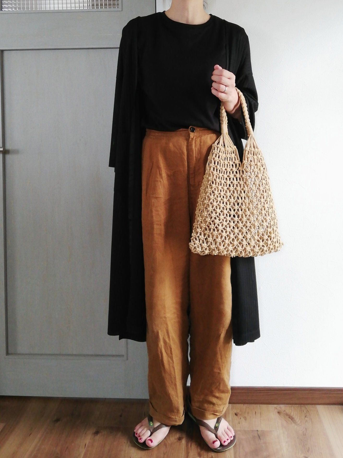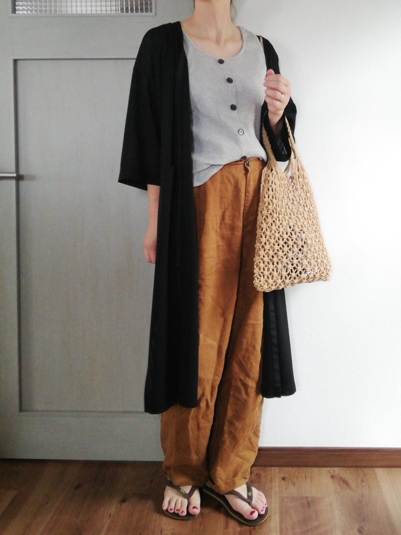 ノースリーブ×リネンパンツ・ビーチサンダルの夏コーデに羽織って、秋を感じられる雰囲気にシフト。