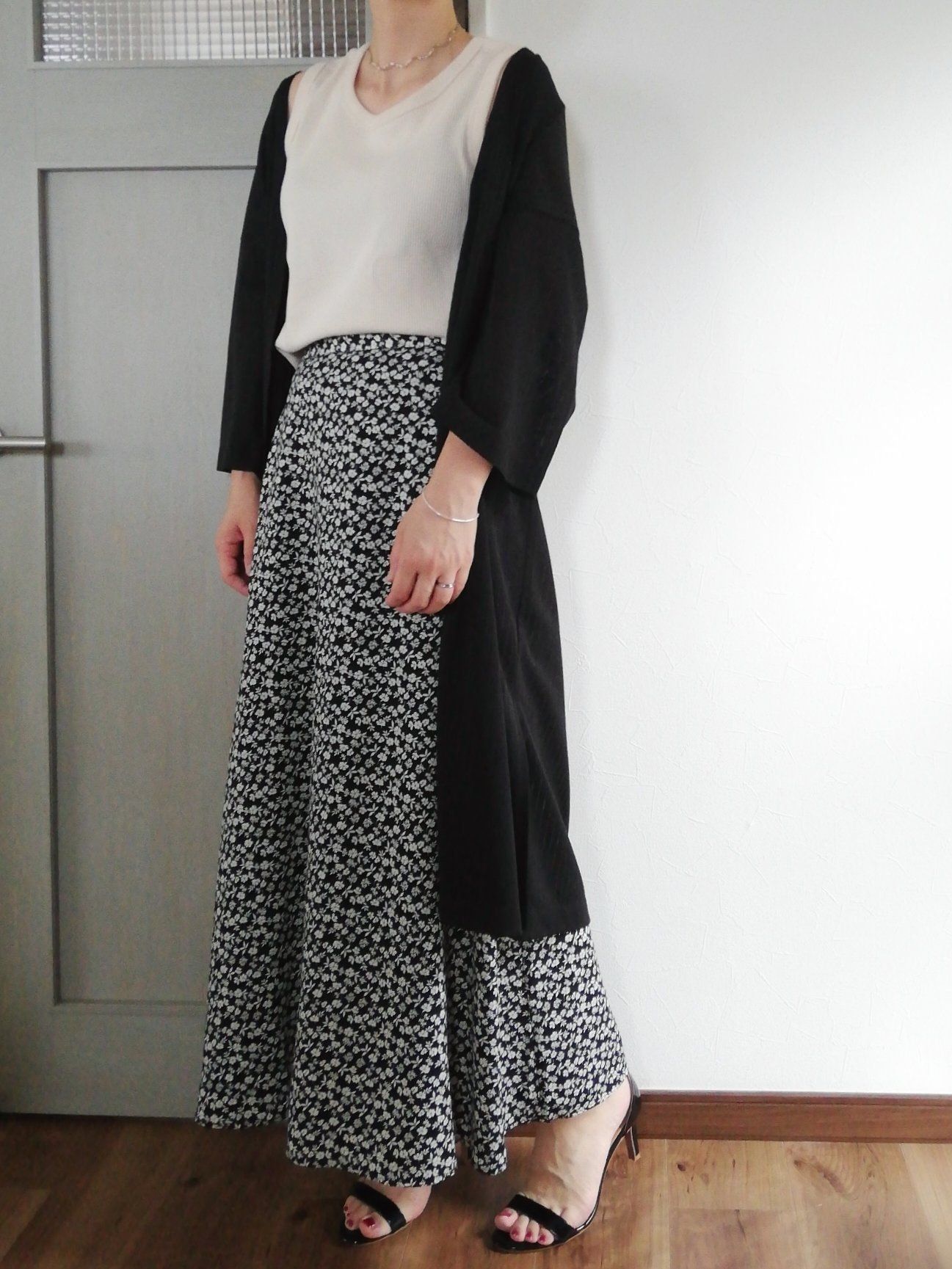 モノトーンで統一した、クールビューティーな着こなし。トレンドライクな小花柄ロングスカートが主役です。