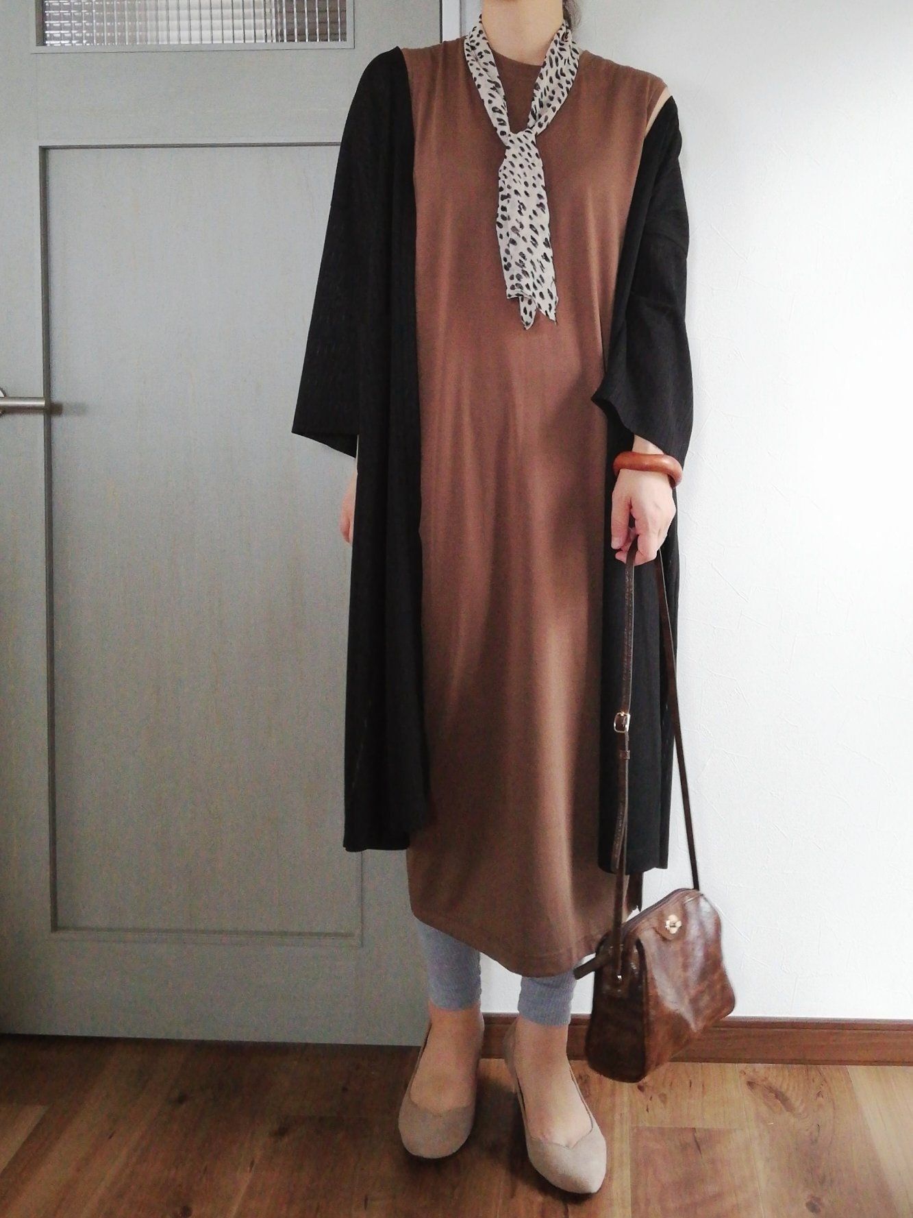 ノースリーブワンピースを秋らしく味つけ。ブラウン・黒・ベージュの落ち着いたトーンで、大人っぽく季節を先取り!