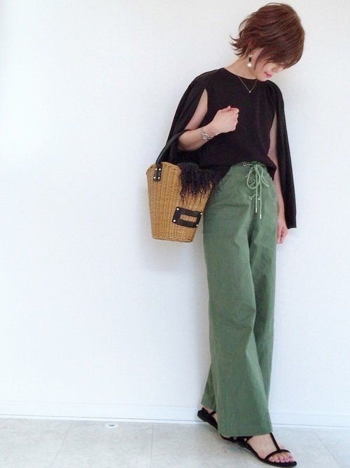 カーキ色のパンツはおしゃれな印象に。フロントのレースアップで、腰回りがすっきり見えるのもうれしいポイント。ワイドなシルエットなので動きやすく、アクティブに決めたい日にもおすすめです。パンツは3,990円。