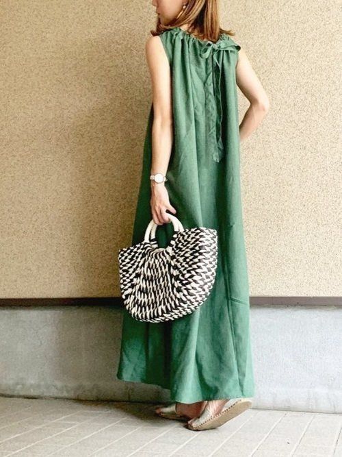 バックにさりげなくついたリボンと、たっぷりのギャザーが大人かわいいワンピース。リボンのサイズは控えめなので甘くなりすぎず、40代でも着こなしやすいですよ。ワンピースは3,990円。