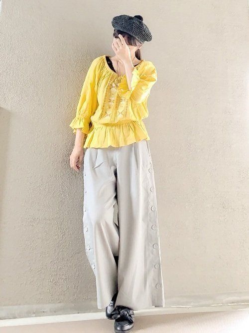 サイドについたくるみボタンがおしゃれなワイドパンツ。ライトグレーは明るい色にも暗い色にも合わせやすく、コーデしやすいカラーなので1つ持っておくと便利です。パンツは3,990円。