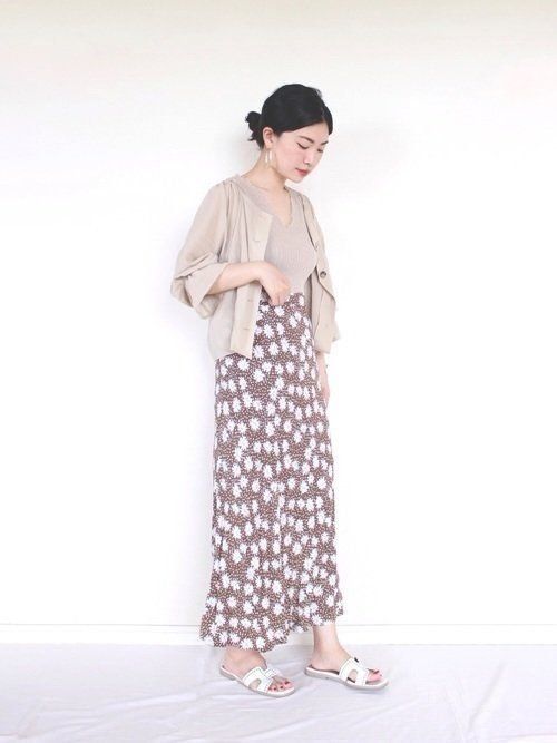 単体で着ても存在感がある柄スカートを、同素材のトップスを合わせてセットアップに。ヴィンテージ感のある色味が、シックな印象を与えてくれます。ほどよい丈感も大人の女性にぴったり。スカートは3,690円。