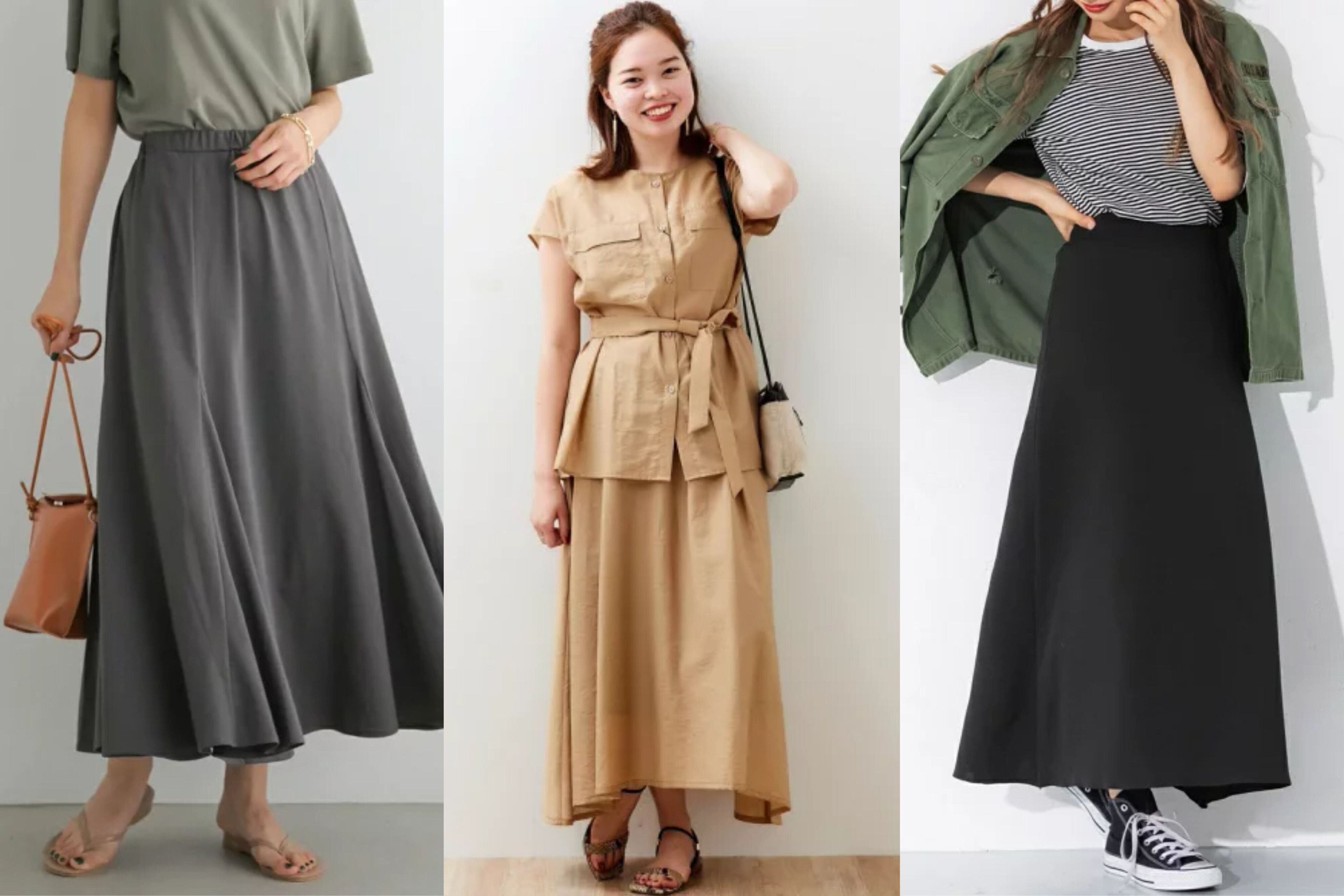 シンプルな形状のフレアスカートは、カラーによって雰囲気をガラッと変えることができます。トップスをコンパクトにまとめると、すっきりスタイルよく着こなせますよ。