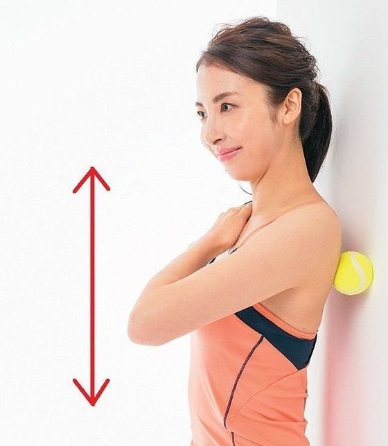 左の肩甲骨と壁の間にテニスボールをあててはさむ。左手で右肩をつかみ、ひじを上げ下げしながら、壁に寄りかかるように体重をかけ、肩甲骨を押し伸ばす。
