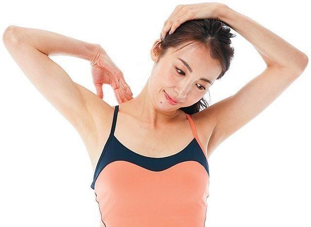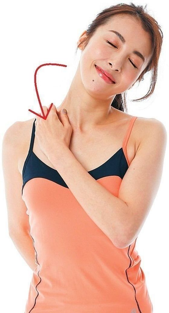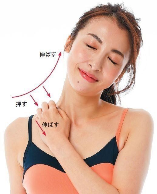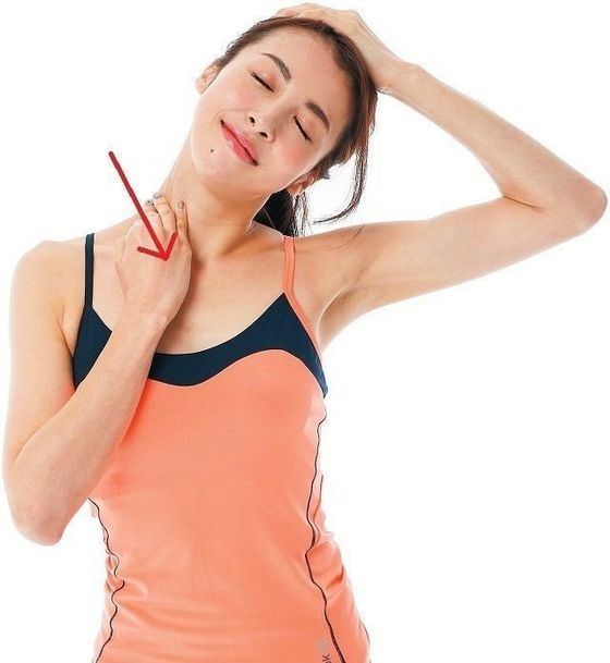 肩こりがひどい人は、鎖骨まわりや首をひねったときに斜めに浮き出る首筋のラインを押し伸ばしましょう。ふだん縮こまりがちな胸まわりを開くことで、肩こりが軽減され、自律神経の回路も整います。