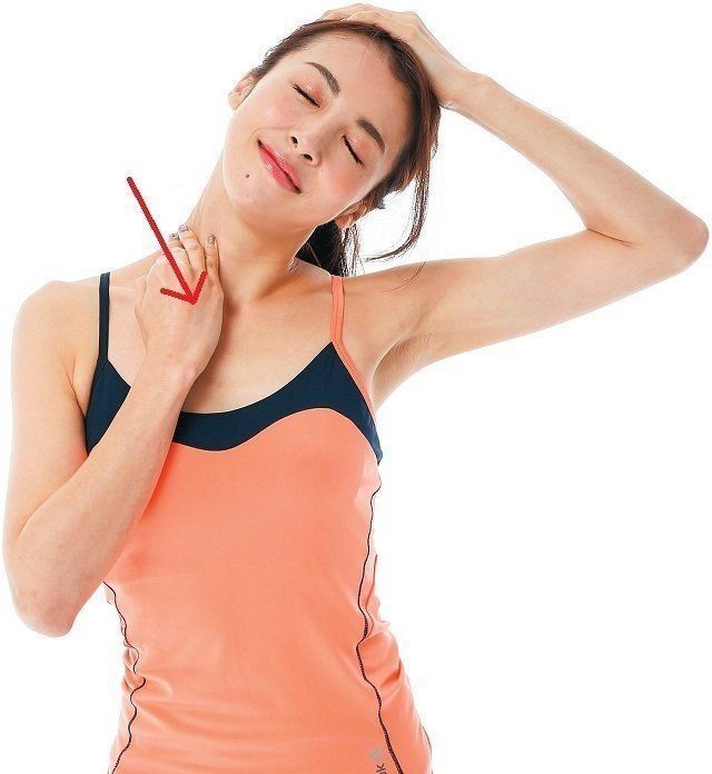 左手を頭に当てて左に倒し、右手を首の右側の真横に当てて圧迫する。そのまま首の前側に向かって押し伸ばす。