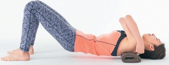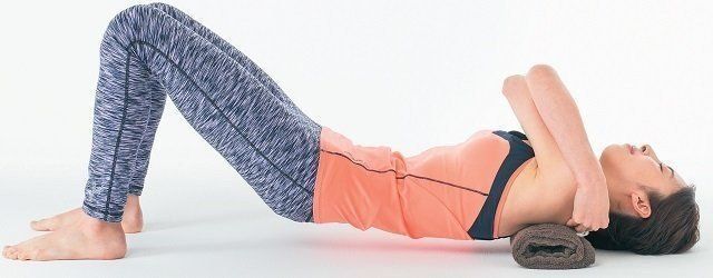 あおむけになってひざを立て、タオルポールを横向きにして肩甲骨にあたるようにはさむ。両腕を交差して両肩をつかみ、肩甲骨を開く。お尻を少し上げて肩甲骨をタオルポールに押しつ
