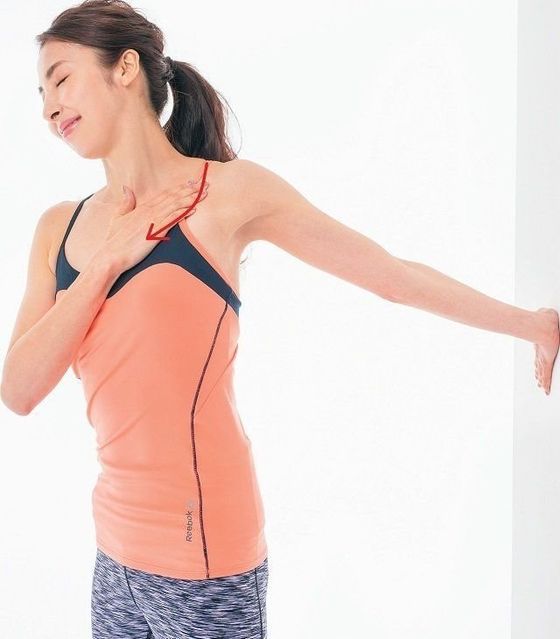 壁を背にして立ち、左手を伸ばして斜め後ろにつく。体を右に向けて首を少し右に傾け、胸の上部の筋膜を伸ばす。右手を左側の鎖骨の下に当てて圧迫し、体の中心部に向かって押し伸ばす。