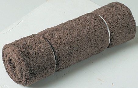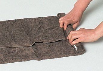 (2)バスタオルの両端を内側に折って雑誌を包み、雑誌ごとクルクル巻いていく。最初のひと巻きは芯になるので、できるだけ小さく巻く。