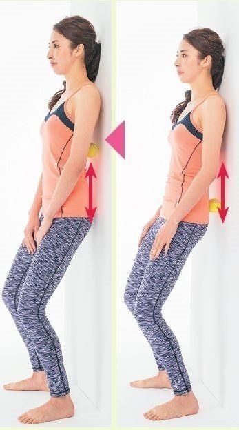 壁を背にして立ち、お尻の割れ目の少し上にテニスボールを当てて壁に押しつける。ひざを屈伸しながらボールが当たる位置を上下させる。さらにボールを肩甲骨の間に移動して上下に転がし、背骨のわきの筋膜を押し伸ばす。背骨のわきの左右にボールを移動して同様に行う。