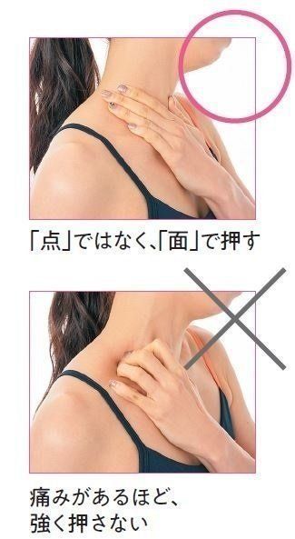 指に力を込めて、痛く感じるほど強く押したり、もんだりすると、逆に筋肉が緊張してこわばったり、毛細血管やリンパを傷つけてしまうので注意!