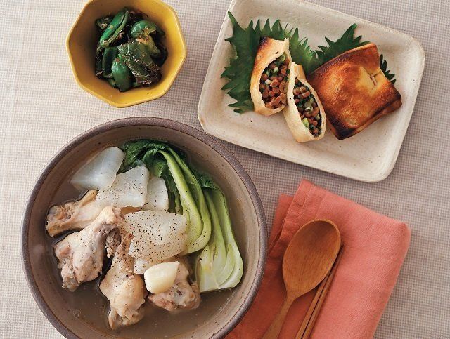(2)鍋に、鶏肉、大根、Aを入れて中火にかけ、煮立ったらアクをすくってふたをして弱火にする。大根が柔らかくなったら青梗菜を加え、しんなりしたら、塩、粗びき黒こしょう、ごま油で調味する。