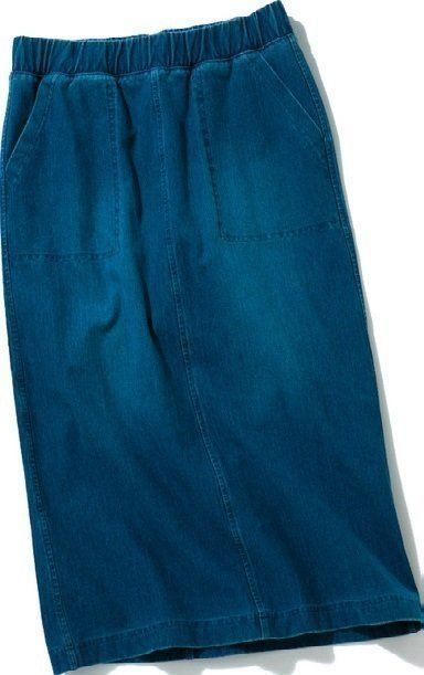 ふんわりスカートは苦手でも、ひざ下丈のタイトスカートなら腰まわりがすっきり見えて◎。シンプルなデニムなら気負わず着られる!/デニムジャージスカート ブルー¥1,990