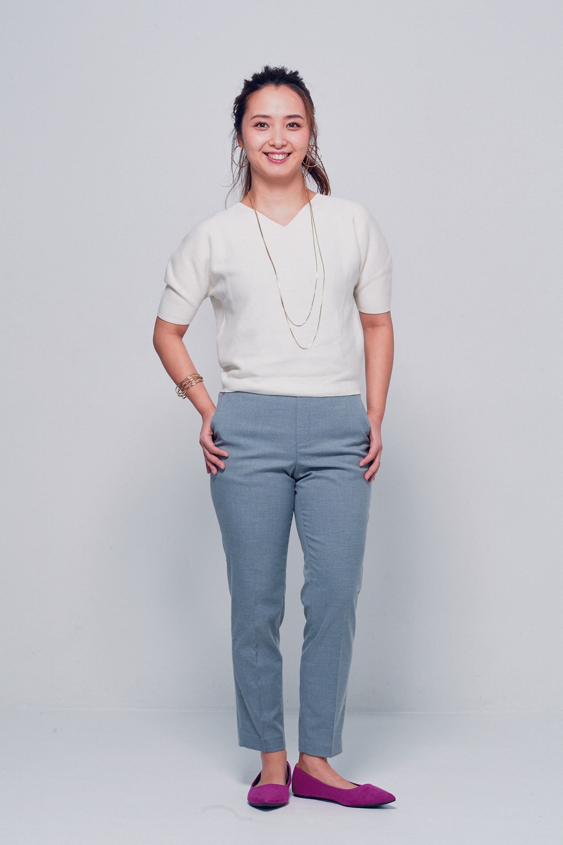 女性らしくて華奢な体形ゆえ、シンプルすぎると貧相な印象に。ラフな格好や硬い素材の服も苦手です。腰まわりが太って見えがちなのでハイウエストを意識すると、バランスがよくなります。