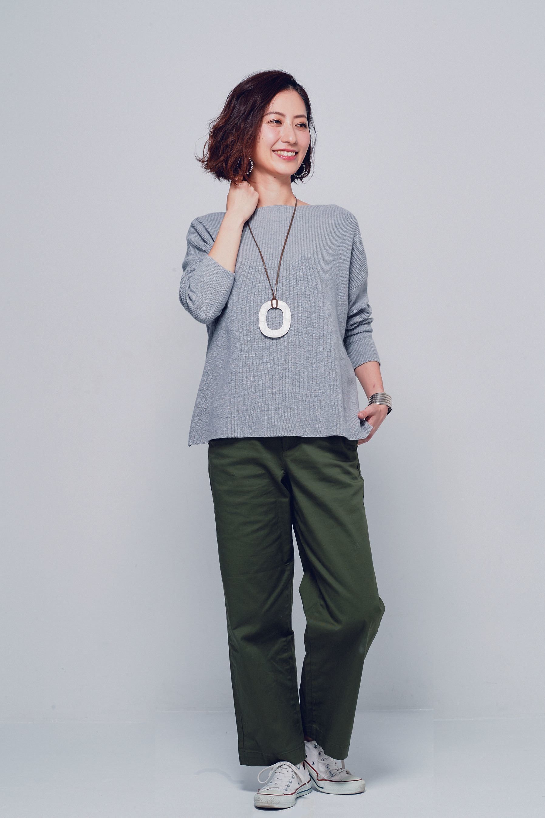 □ざっくりした素材や味のあるデザインの物をルーズに着るのも得意