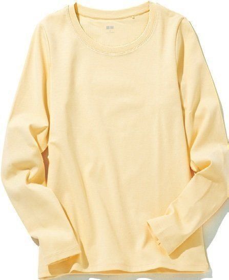 ピタッともゆるっともしないスタンダードなTシャツを着こなせるのがこのタイプ。デコルテが見えるくらいのあきがあるとすっきり/コットンフライスクルーネックT(長袖)イエロー¥1,000