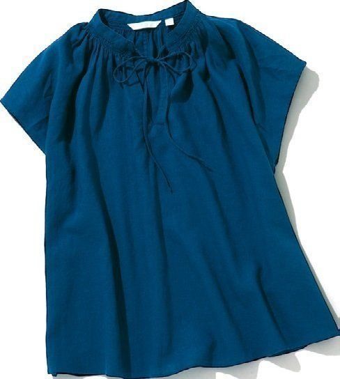 ざっくり着られるリネンは、得意素材。首まわりにデザイン性のあるような、シンプルすぎないシャツを大人カジュアルに着こなして!/リネンブレンドギャザーブラウス ブルー¥1,990