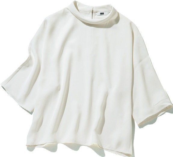 着るだけで華やかに見えるとろみ素材は、シンプルが苦手なウェーブタイプのお助けアイテム。華奢な首まわりが隠れるタイプが◎/ドレープブラウス オフホワイト¥1,990