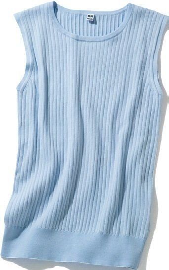 華奢なので、二の腕を出してもOK。体にフィットする柔らか素材&襟が詰まっている物を選んで、女性らしさをアピール!/UVカットスーピマコットンセーターブルー¥1,990