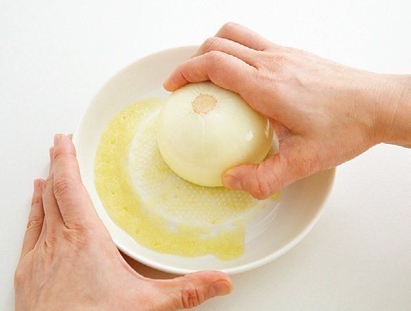 バラバラにならないように根を残したまま、玉ねぎをすりおろしてボウルに入れる。玉ねぎは、冷蔵室で冷やしてからすりおろすと目が痛くなりにくい。