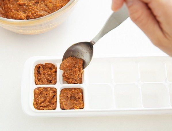 材料をミキサーで混ぜ合わせ、チャックつきの保存袋に入れて平らにならして凍らせる。使うときは袋の上から手で適当な大きさに割り、30g×人数分を量って使いましょう。