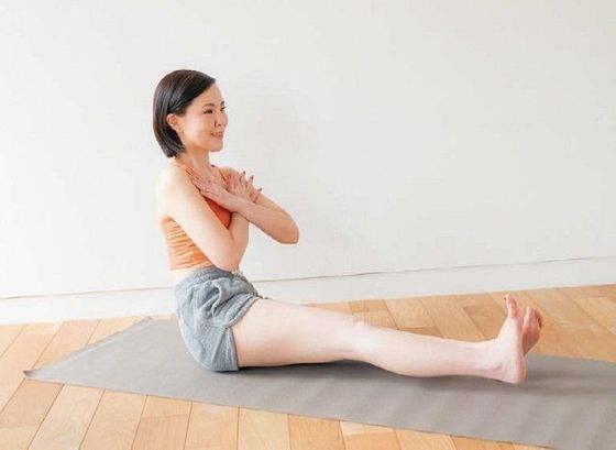 あおむけになり、ひじをついて上体を起こし、床と45度の角度になるように両足を上げる。足を限界まで開いてとじるを20回繰り返す。ひざが曲がらないよう注意する。