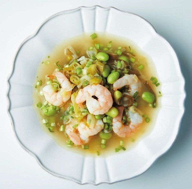 (1)鍋にごま油を中火で熱し、ねぎを炒める。水4カップを加え、沸騰したら、えび、枝豆を加えてひと煮立ちさせる。