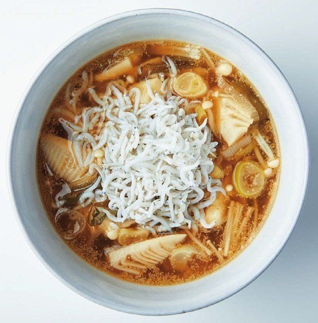 (1)鍋にごま油を中火で熱し、ねぎを炒める。水4カップを加え、沸騰したら、たけのこ、えのきだけを加えてひと煮立ちさせる。
