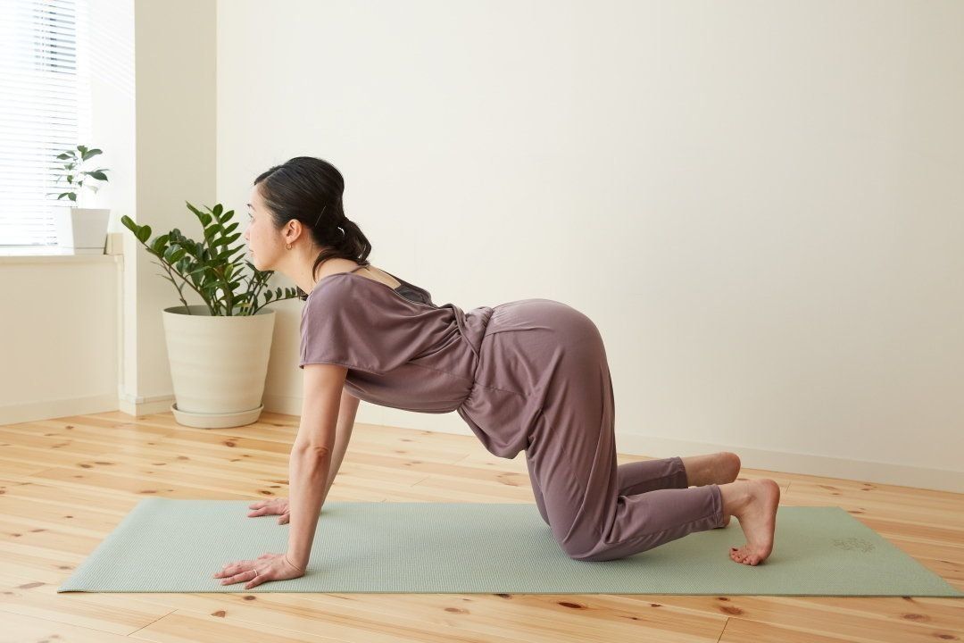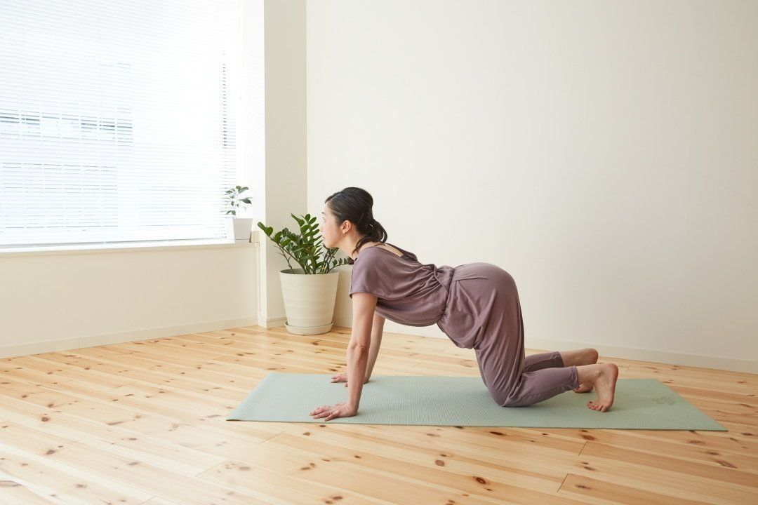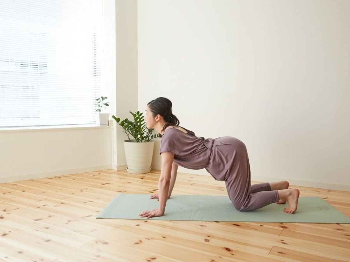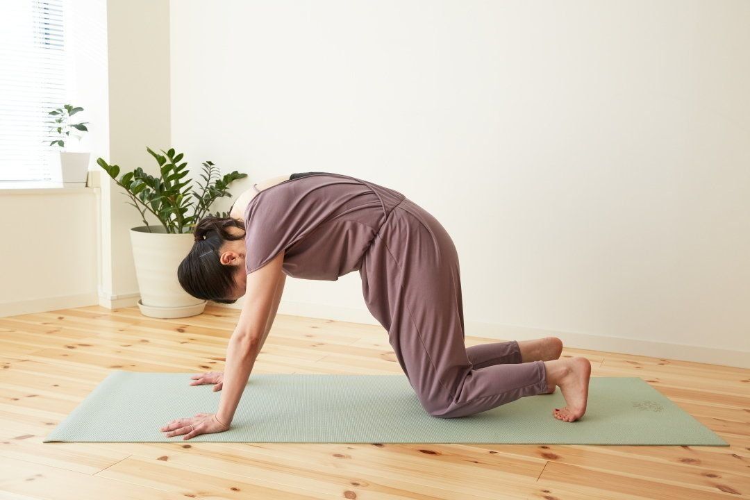 ③息を吐きながら、背中を丸める。おへそを天井に向けて引き上げ、お腹を見る。②~③を呼吸に合わせて5回ほど繰り返す。