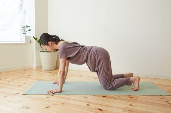①四つん這いになり、手を肩幅、脚を腰幅に広げる。