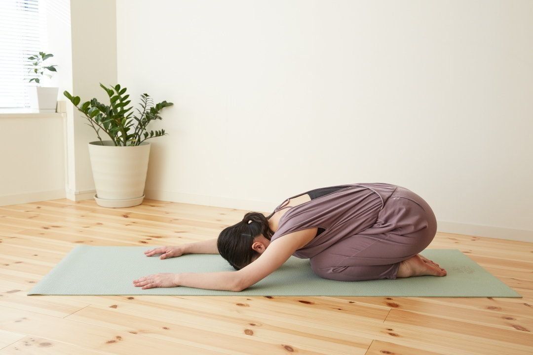 波のように背骨を丸めるキャット(猫)と反らすカウ(牛)のポーズから、お祈りするように休むチャイルドポーズへ。一連のポーズを流れで行って、溜った疲れをオフ。翌日への疲れの持ち越しを防ぎます。首や肩などの上半身の緊張が緩まるので、呼吸が深まり、心も安らぎます。