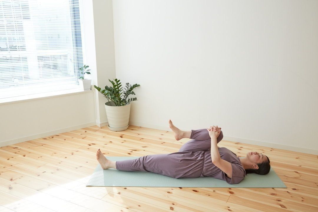 今回は、太ももの前面と鼠径部を伸ばす「片ひざを抱えたポーズ」に挑戦しましょう。