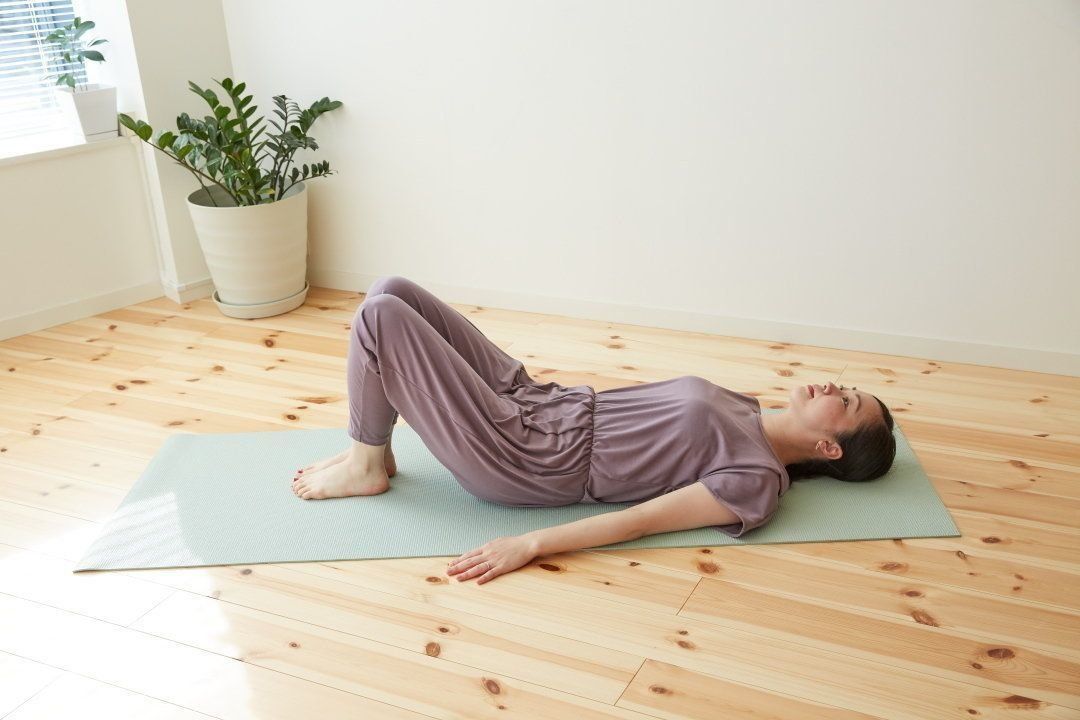 仰向けで片ひざを胸に引き寄せるポーズです。引き寄せたひざ側の背中や腰、伸ばした脚の太ももの前面を心地よく伸ばします。下半身に溜まりがちな老廃物の排出を促すので、座り仕事の人、運動不足の人におすすめです。仙骨を刺激し、副交感神経を優位にすることでリラックスモードに切り替えます。