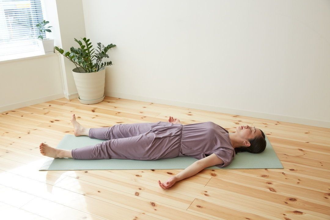 【3】床に右脚を伸ばし、両手を広げて、ゆっくり呼吸しながら脱力。反対側も同様に行う。