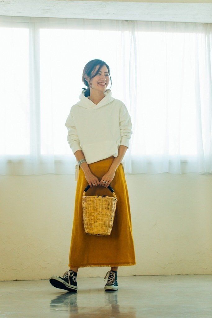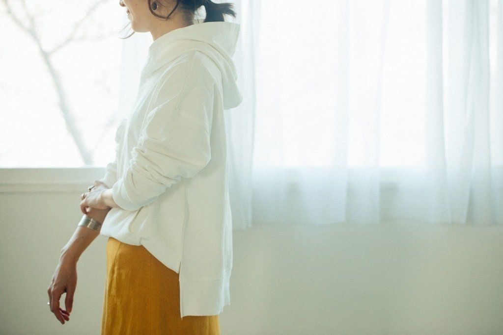 そんなときこそ、パーカの出番。女性らしいスカートにスポーティな雰囲気が加わって「今の気分」のコーディネイトに仕上がります。潔く真っ白なパーカを選ぶことも、洗練された印象に見せるコツですよ。