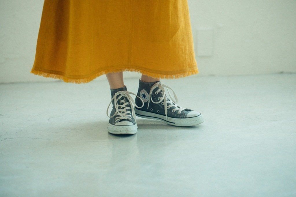 最後の仕上げは、足元。ボリュームのあるロングスカートの足元は、ハイカットのスニーカーがよく似合います。コンバースのオールスターは、定番の白や黒もいいですが、今年ならグレーやベージュなどの中間色がおすすめ。着こなしにニュアンスをプラスできますよ。