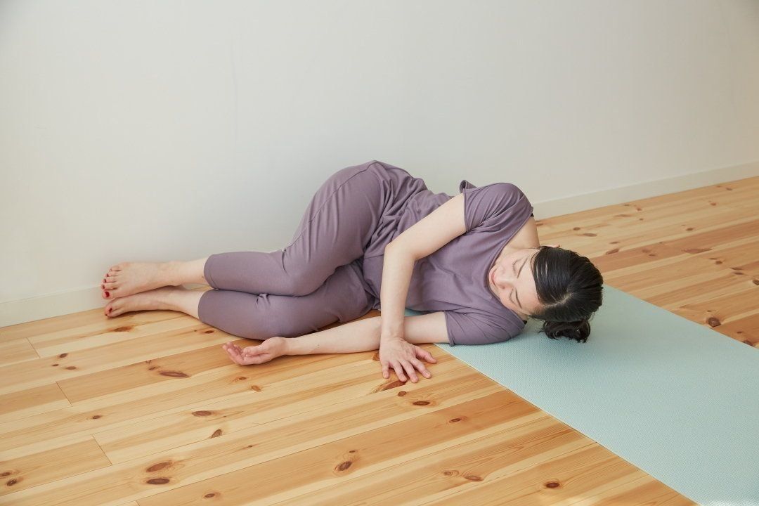 【2】壁と反対側に体を倒す。体の左側を床につけてから、お尻を壁に近づける。