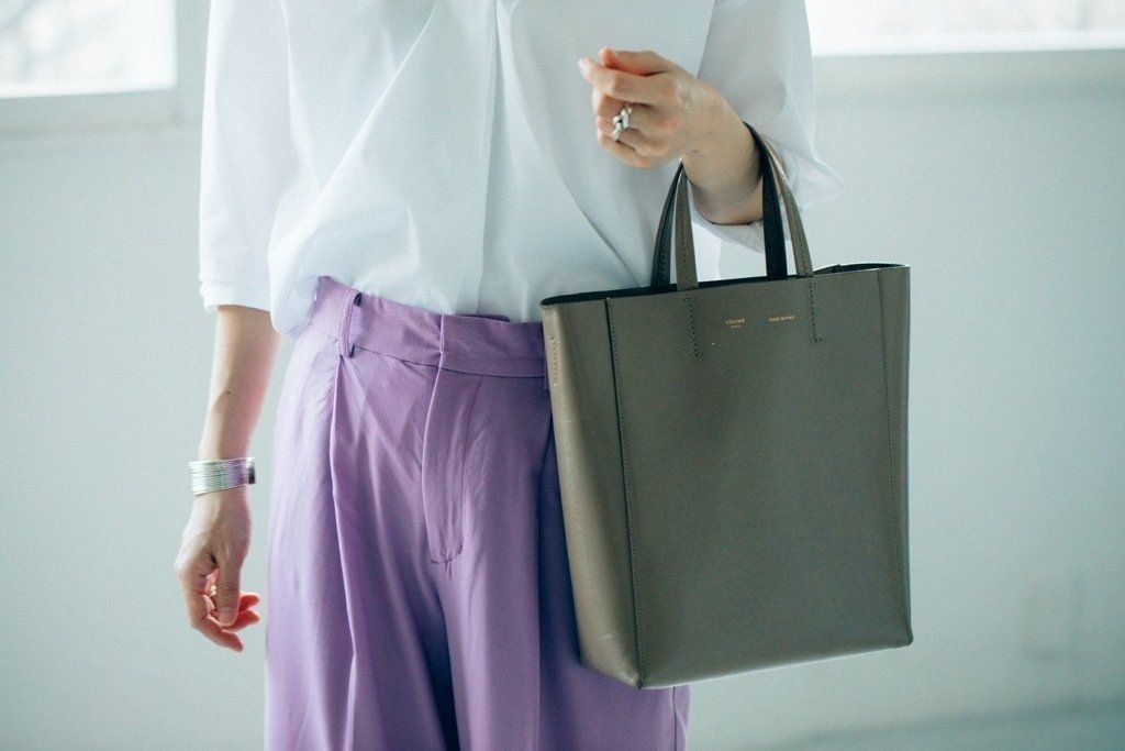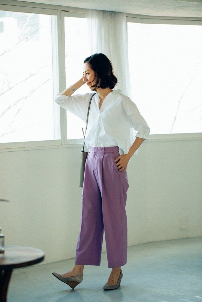 そして、難しいカラーアイテムを着るときこそ、いつもの白シャツが大活躍。ほら、白シャツが間に入ることで、一見着こなすのが難しそうなラベンダーのパンツも、上品に着こなせていると思いませんか?