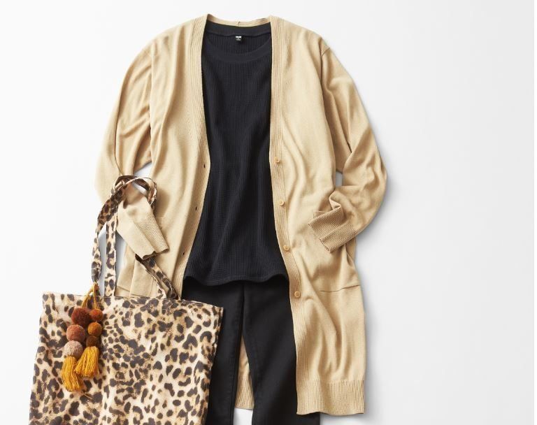 UVカットロングカーデ¥2,990、ワッフルTシャツ¥1,000、黒のストレッチジーンズ¥3,990/ユニクロ