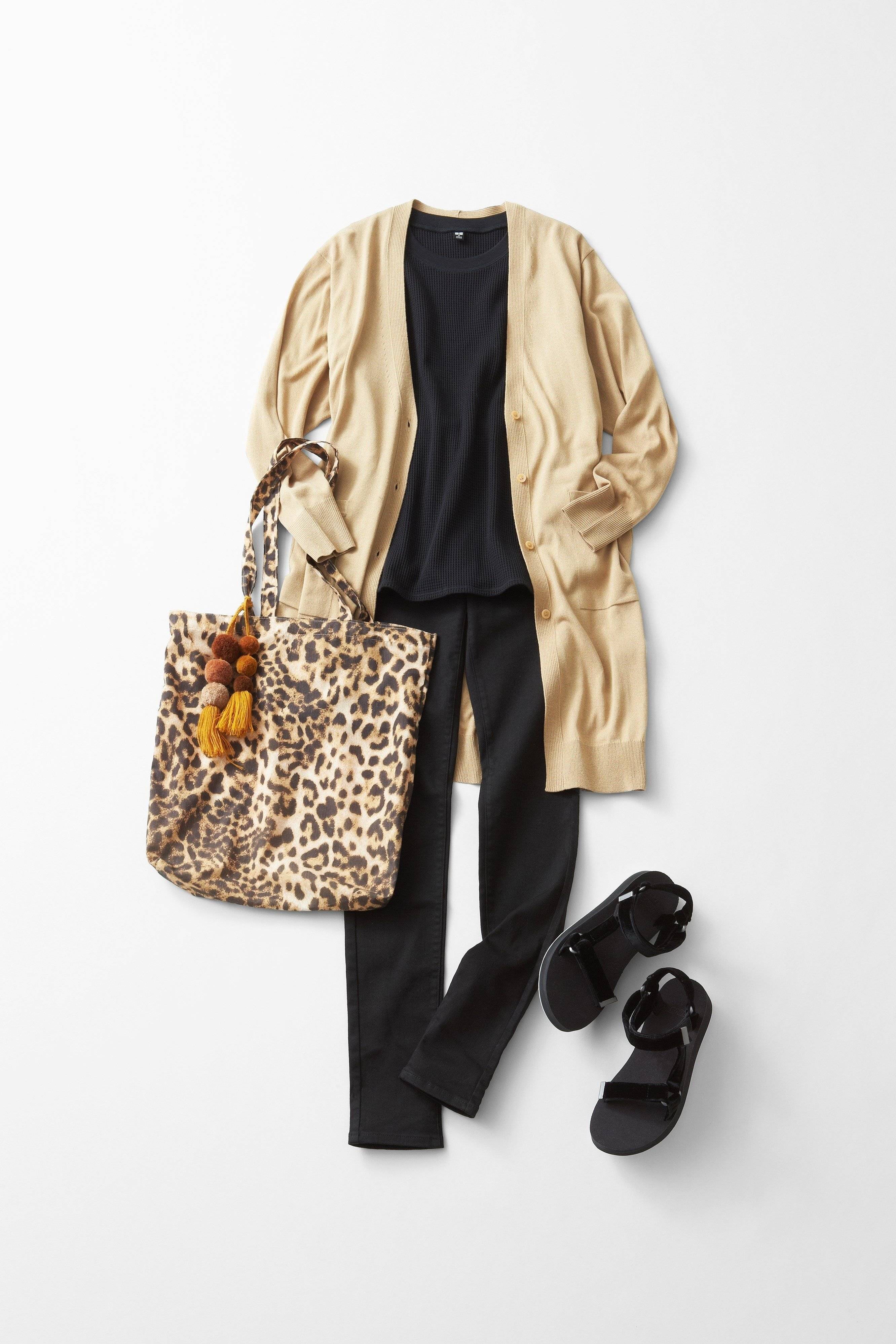 黒のインナーとパンツに、明るいベージュのカーディガンを合わせるだけで、ミニマムでシックな着こなしが完成!足元は、トレンドのスポーツサンダルで軽快に仕上げると、重たくなりません。