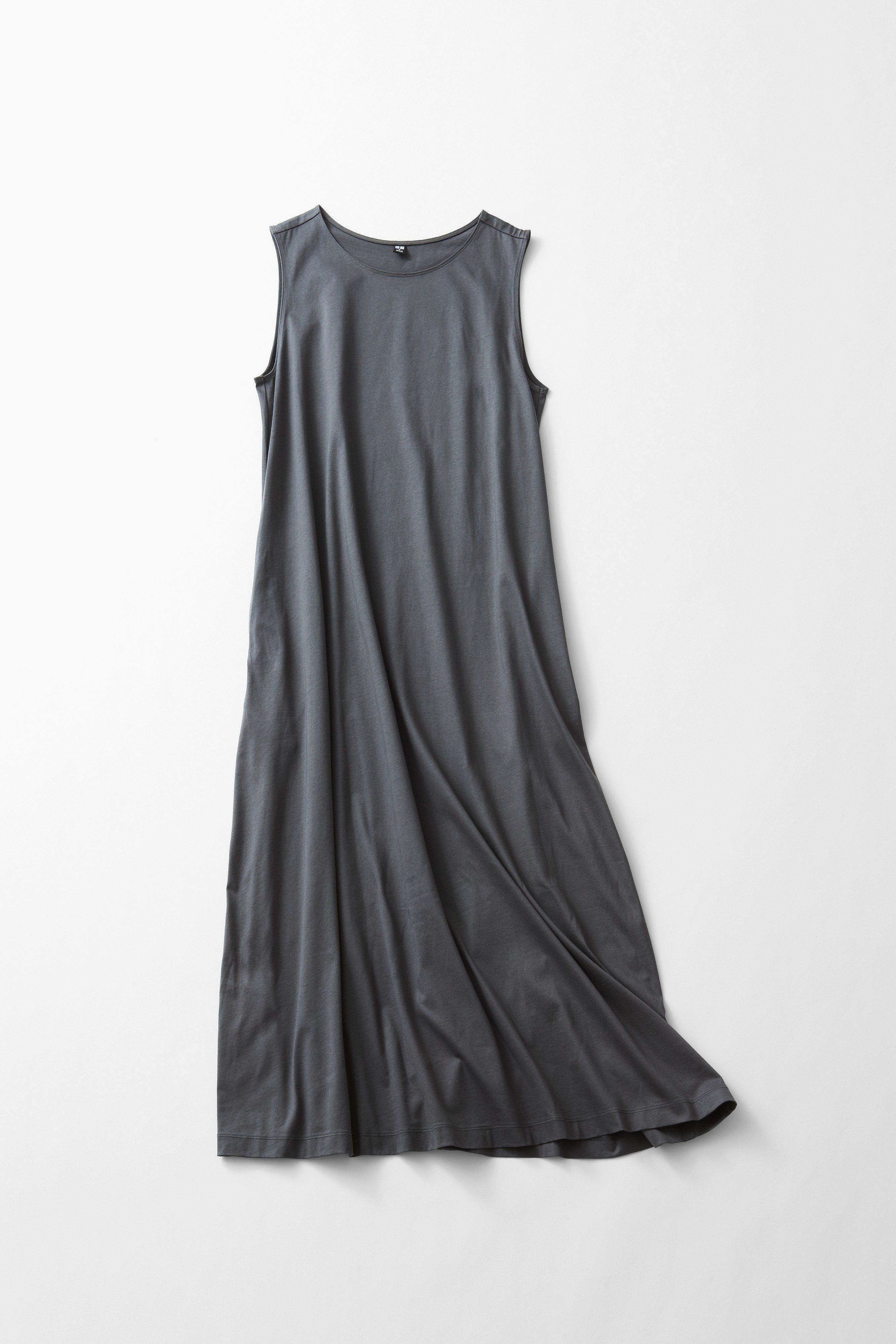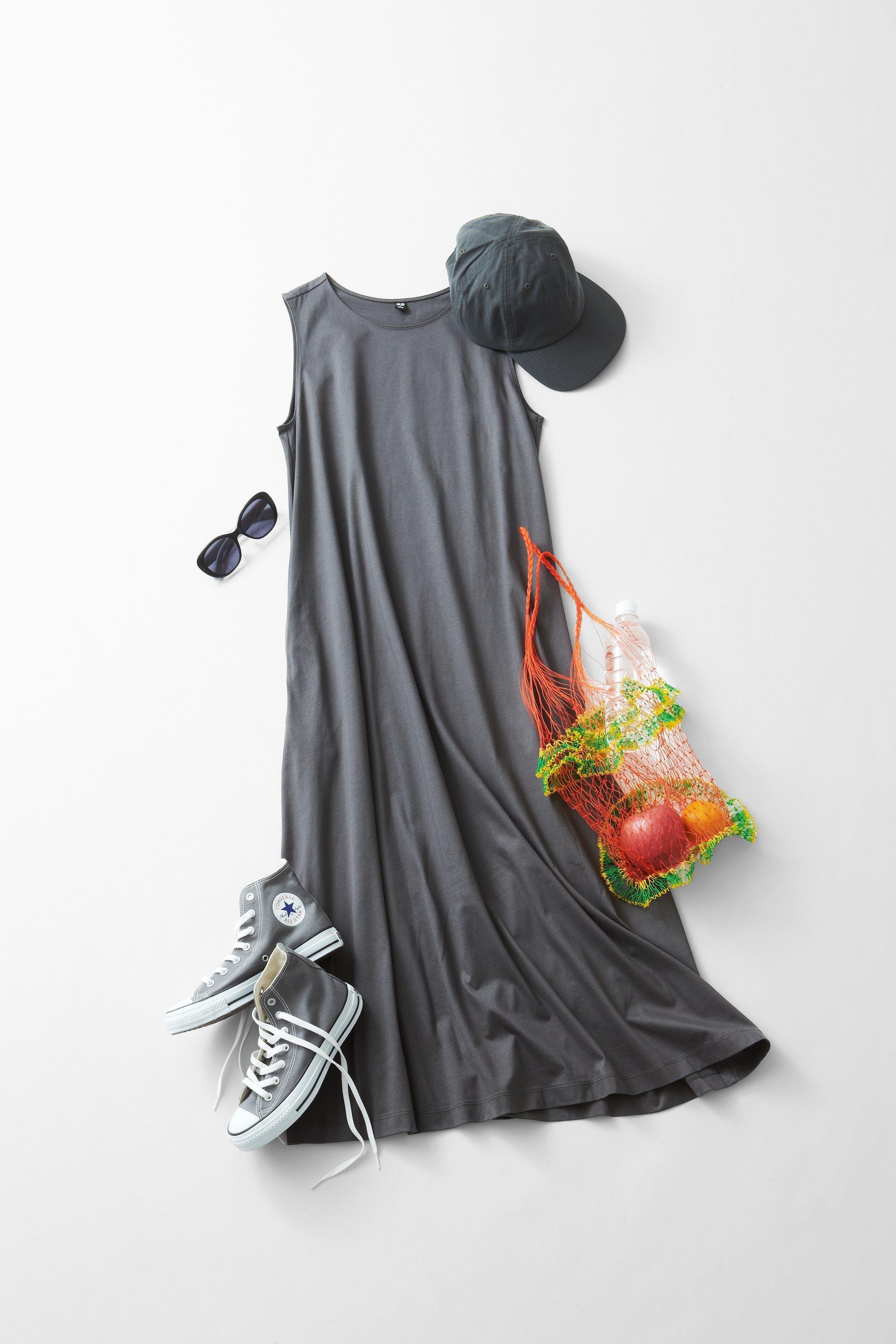 1枚でさらりと着たい、ノースリーブのシンプルなロングワンピース。一見ボーイッシュな着こなしも、ダークカラーでまとめれば、大人に似合うスポーティカジュアルに仕上がります。