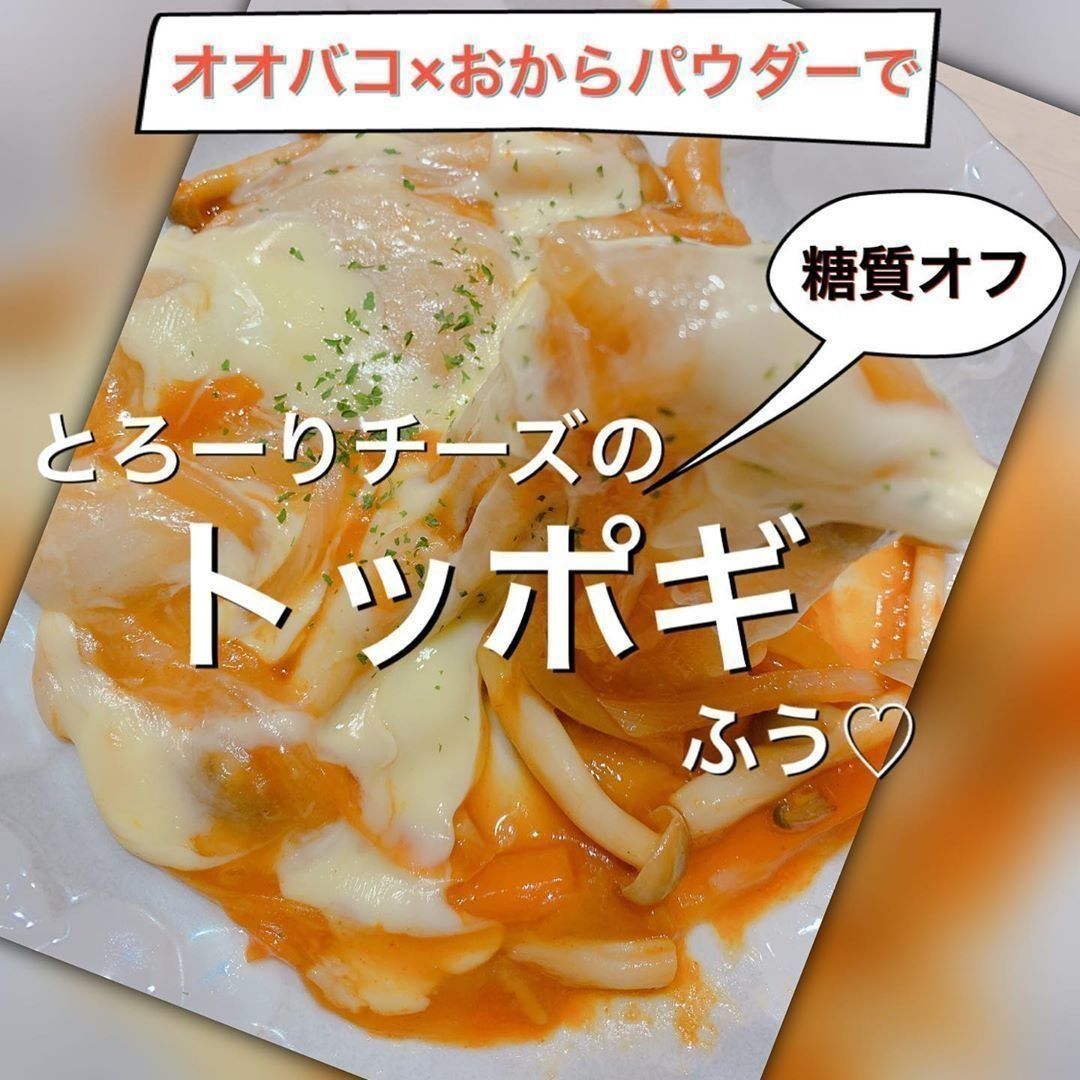 オオバコとおからパウダーでつくった糖質オフのおから餅を、トッポギ風にアレンジ。まず、玉ねぎ、にんじん、しめじを炒め、水と醤油、ラカント、コチュジャン、おろしにんにくを入れて煮詰めます。それにトッポギのような形に整えたおから餅を加え、最後にチーズをのせたら完成。おから餅はアイデア次第でいろいろな料理に使えそうですね。