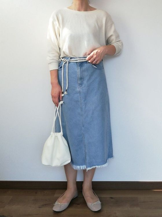 ライトカラーのデニムは、白トップスに合わせると全体的に夏っぽい印象に。秋コーデにシフトするには、ボトムスや小物を変えてみましょう。