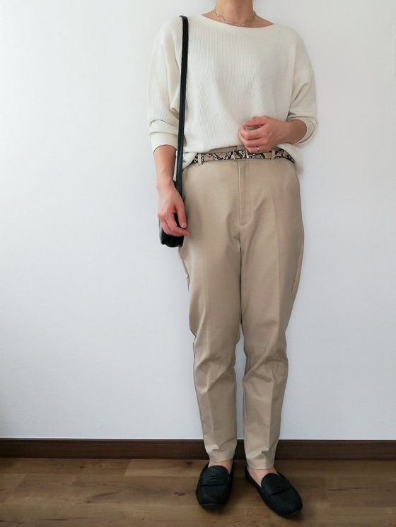 センタープレス入りのチノパンなら、カジュアルなワッフルTもきれいめな着こなしに。白×ベージュ×黒でまとめると、洗練された印象になって◎。
